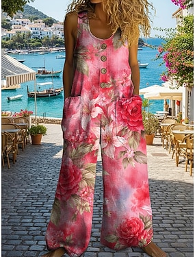 Damen Overall Aktiv Blumen Ärmellos Ärmellos Weites Bein U-Ausschnitt Tasche Knöpfe Täglich Strand Lässiger Schnitt Rosa Sommer