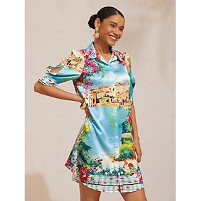 Urlaubskleid aus Satin mit künstlerischem Blumenmuster und taillierter Passform