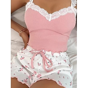Damen Schlafanzug Set Lässig Komfort Blumen Spitze Elastischer Bund Trägertop Shorts Täglich Heim Ärmellos Träger Blau Rosa Wein Khaki Sommer Frühling Normale Passform