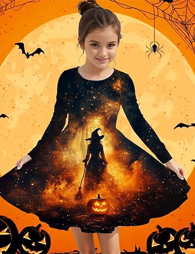 Halloween Mädchen' 3D Grafik Kleid Langarm Sommer Frühling Urlaub Täglich Ferien Prinzessin Schön Süß Kinder 4-12 Jahre Freizeitkleid A Linie Kleid Knielang Normale Passform