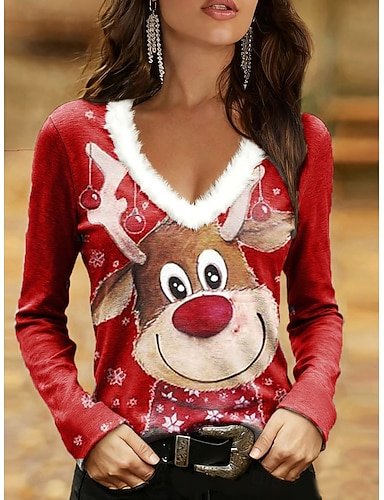 Weihnachten Damen T Shirt Grafik Rentier Vintage Stilvoll Klassisch Langarm V Ausschnitt Normale Oberteile Täglich Patchwork Druck Rote Blau Purpur Grün Herbst Winter