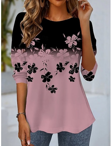 Damen T Shirt Ombre Blumen Grafik Vintage Stilvoll Klassisch Langarm Rundhalsausschnitt Rundhals Normale Oberteile Täglich Druck Rosa Frühling Herbst Winter
