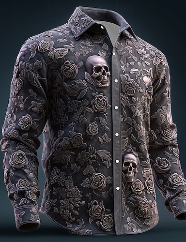 Herren Blumendruck Tag der Toten Totenkopfe Hemd Knopfhemd Langarm Dark Punk Gothic Outdoor Ferien Frühling Herbst Umlegekragen 3D-Druck Leinenähnliches Hemd Schwarz 1 Schwarz Schwarz 2