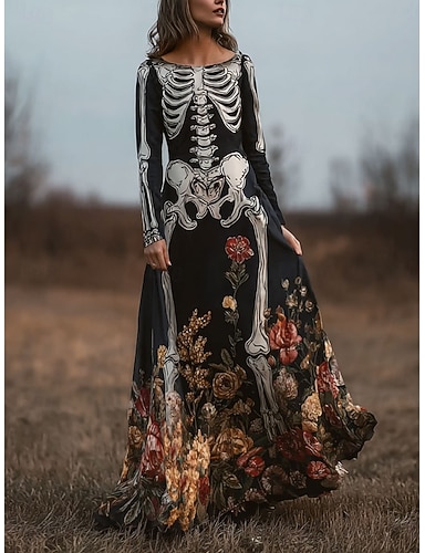 Halloween Damen Skelett Bodenlänges Schmal Kleid A-Linie Kleid Lässig Boho Hochzeitsgast Strand Reguläre Passform Florale Grafik Lange Ärmel Rundhals Schwarz Frühling Herbst Winter