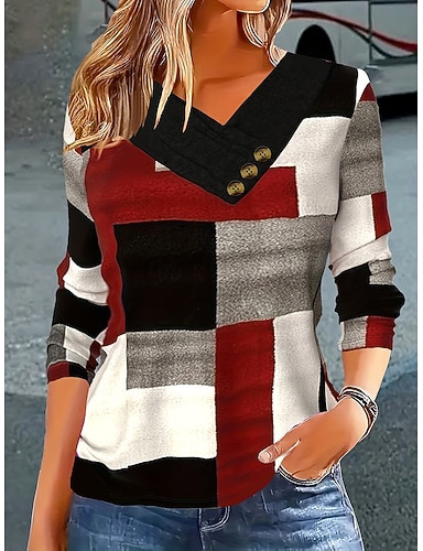 Damen T Shirt Grafik Geometrisch Farbblock Vintage Stilvoll Klassisch Langarm V Ausschnitt Normale Oberteile Täglich Knöpfe Druck Asymmetrisch Gras-Grün Schwarz und Grau Wein Herbst Winter