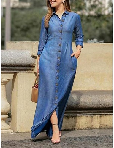 Damen Maxikleid Shiftkleid Lässig Täglich Normale Passform Einfach Langarm Revers Schwarz Marineblau Blau Sommer Frühling Herbst