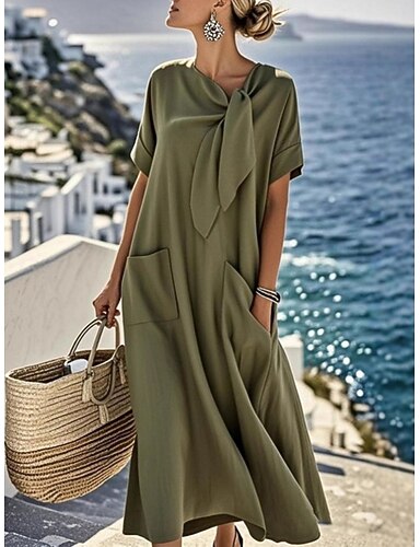 Damen Midikleid A Linie Kleid Lässig Täglich Lässiger Schnitt Einfach Kurzarm Einkerbiger Ausschnitt Blau Braun Armeegrün Aprikose Sommer