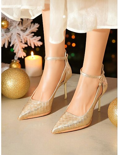 Damen-Pumps mit goldenem Knöchelriemen und spitzer Zehenpartie, elegante, glänzende Stiletto-Schuhe für die Weihnachtsfeier &Cocktail-Events
