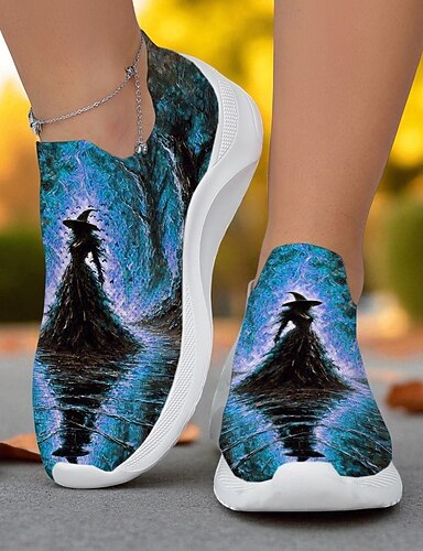 Slip-On-Sneakers mit Hexen-Kunstdruck für Damen mit bequemer Polsterung, Freizeitschuhe für Halloween-Festivals für Kostümpartys und den Alltag