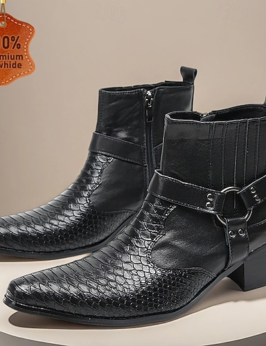 Herren Harness Boots aus schwarzem Echtleder mit Krokoprägung und Blockabsatz, Motorrad-Cowboystiefel aus Rindsleder für Bühnen-, Club- und Gothicmode