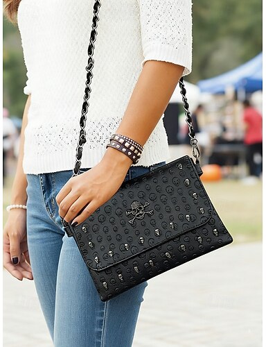 Damen-Umhängetasche mit Halloween-Totenkopf – Gothic-Schultertasche aus Kunstleder mit Kettenriemen für Partys, Cosplay und Ausgehen