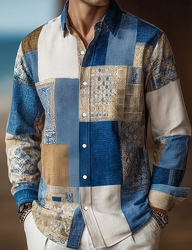 Herren Farbblock Patchwork Geometrisches Muster Hemd Knopfhemd Langarm Vintage-Retro Outdoor Alltagstauglich Frühling Herbst Umlegekragen 3D-Druck Leinenähnliches Hemd Blau Grün Wein Blau Braun Grün