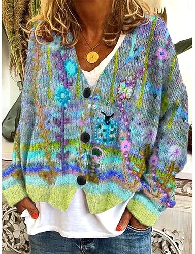 Damen Pullover Strickjacke Elegant Vintage Mode Blumen V Ausschnitt Tasche Blumen Gestrickt Langarm Normale Oberteile Stricken Outdoor Täglich Wochenende Rosa Purpur Herbst Winter