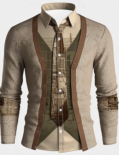Herren Neuheit Falscher Kragen und Cardigan-Design Hemd Knopfhemd Langarm Vintage-Retro Outdoor Alltagstauglich Frühling Herbst Umlegekragen 3D-Druck Hemden mit Kragen Hellkaki Khaki