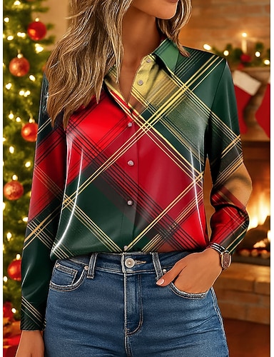 Weihnachten Damen Arbeitshemd Grafik Karomuster Elegant Vintage Tropisch Langarm Hemdkragen Normale Oberteile Arbeit Party-Abendmode Täglich Rosa Rote Blau Grün Herbst Winter Frühling, Herbst