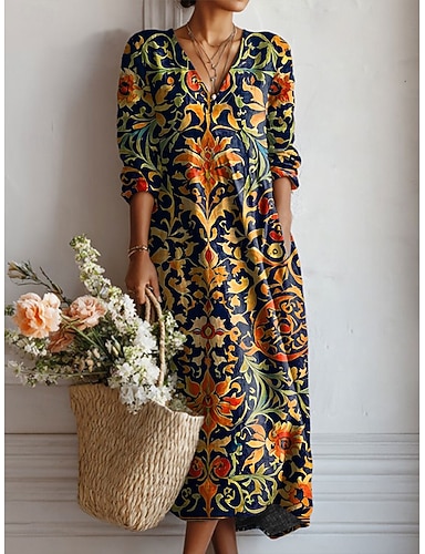 Damen Midikleid A Linie Kleid Urlaub Lässig Täglich Normale Passform Blumen Grafik Langarm V Ausschnitt Rosa Marineblau Blau Grün Frühling Herbst