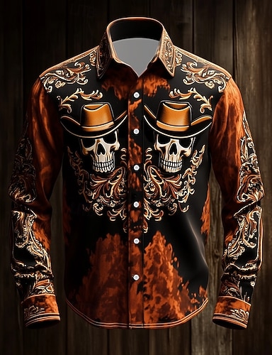 Herren Paisley-Muster Schädel Tag der Toten Hemd Westernhemd Cowboy-Shirt Langarm Ethnisch Vintage-Retro Outdoor Urlaub Frühling Herbst Umlegekragen 3D-Druck Leinenähnliches Hemd Schwarz Orange