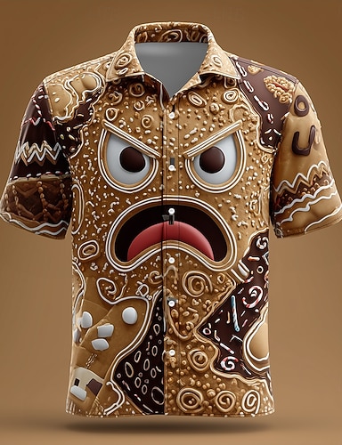 Weihnachten Herren 3D Zeichentrick Lebkuchenmann Wütendes Gesicht Hemd Knopfhemd Kurzarm Lustig Outdoor Ferien Sommer Frühling Umlegekragen 3D-Druck Hemden mit Kragen Braun
