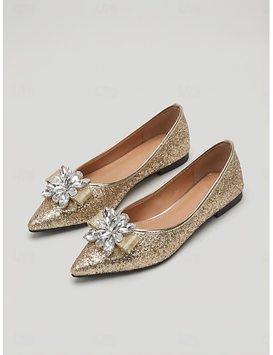 Goldglitzernde Brautschuhe für Damen, spitze Hochzeitsschuhe mit Kristallblumen-Applikation für Zeremonie und Empfang &Brautkomfort