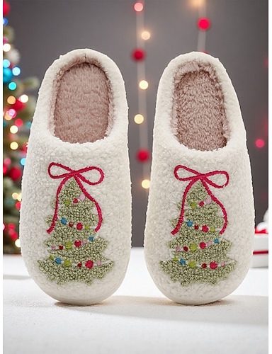 Weiße Weihnachtsbaum-Hausschuhe für Damen mit Plüschfutter, gemütliche Winterhausschuhe für die Weihnachtsfeier &Geschenke machen
