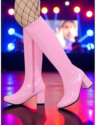 Kniehohe Damenstiefel aus silbernem Lackleder mit Blockabsatz, modische Stiefel im Retro-Go-Go-Stil der 1980er Jahre für Partys und Tanzauftritte &Abend