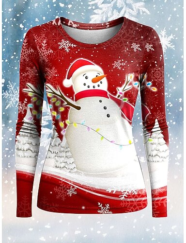 Weihnachten Damen T Shirt Grafik Schneemann Mode Lässig Langarm Rundhalsausschnitt Normale Oberteile Täglich Wochenende Druck Weiß Rosa Rote Grau Frühling Herbst Winter