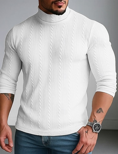 Herren T Shirt Geripptes Strick-T-Shirt T-Shirt Langarmshirt Langarm Rollkragen Frühling Herbst Winter Einfach Grubenstreifen Mode Designer Basic Stricken Urlaub Straße Lässig Weiß Marineblau