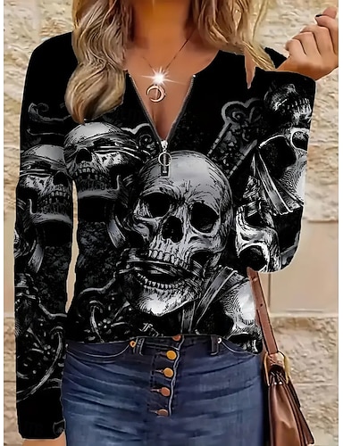 Halloween Damen T Shirt Grafik Schädel Mode Lässig Langarm Rundhalsausschnitt Rundhals Normale Oberteile Täglich Reißverschluss Druck Schwarz Frühling Herbst Winter
