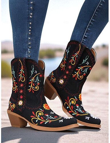 Dunkelbraune Cowboystiefel aus Kunstleder für Damen mit gesticktem Westernmuster, stylische Stiefel mit halbhoher Schafthöhe für lässige Outfits &Country-Konzerte