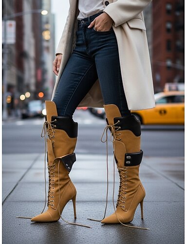 Kniehohe Schnürstiefel für Damen mit Stilettoabsatz – modische Stiefel aus braunem Leder mit spitzer Zehenpartie für Partys, Ausgehen und Herbst-Winter-Outfits