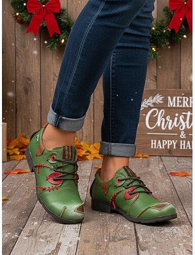 Grüne Oxford-Schnürschuhe aus Leder für Damen mit roten Nähten, handgefertigte Retro-Freizeitschuhe für Damen, perfekt für Weihnachtsoutfits und den Alltag im Herbst