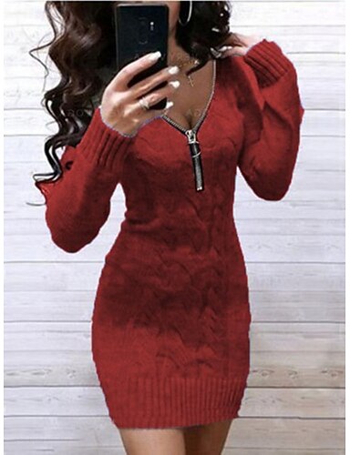 Damen Pullover Pullover Kleid Lässig Weich Einfarbig Gerippt V Ausschnitt Reißverschluss Gestrickt Langarm Lange Oberteile Stricken Outdoor Party Täglich Wein Armeegrün Herbst Winter