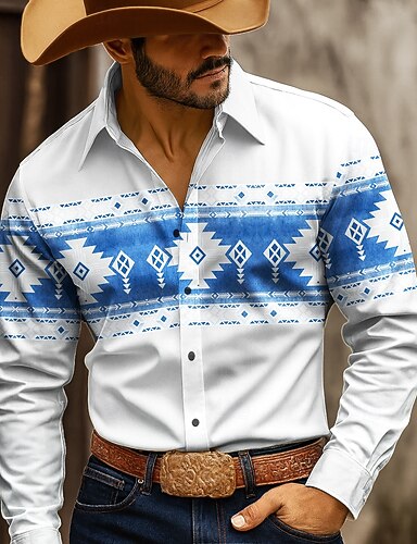 Herren Geometrisch aztekisch Ethnisch Hemd Westernhemd Cowboy-Shirt Langarm Vintage-Retro Outdoor Campen und Wandern Jagd Frühling Herbst Umlegekragen 3D-Druck Hemden mit Knopfleiste Wei