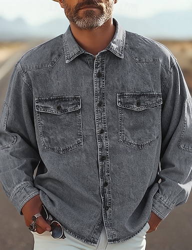 Herren Hemd Sommerhemd Freizeithemd Knopfhemd Jeanshemd Schwarz Blau Langarm Einfach Revers Urlaub Hawaiianisch Fronttasche Bekleidung Polyester Mode Lässig Bequem