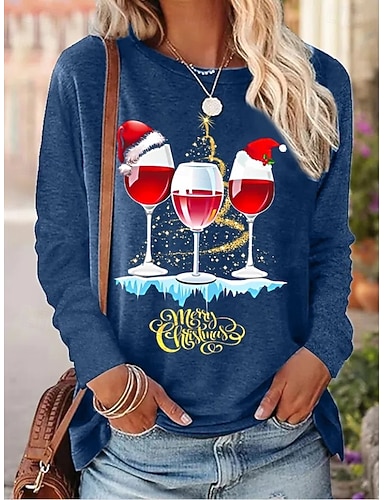 Weihnachten Damen T Shirt Weinglas Vintage Stilvoll Klassisch Langarm Rundhalsausschnitt Rundhals Normale Oberteile Wochenende Druck Schwarz Rosa Blau Khaki Winter