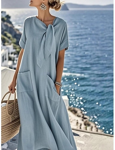 Damen Midikleid A Linie Kleid Lässig Täglich Lässiger Schnitt Einfach Kurzarm Einkerbiger Ausschnitt Blau Braun Armeegrün Aprikose Sommer