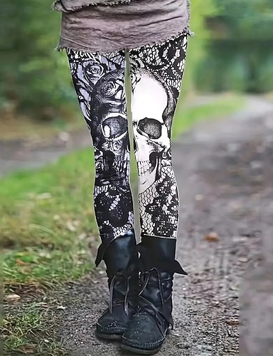 Damen Leggings Gemütliche Leggings Basic Lässig Volle Länge Hohe TaillePantsHalloween Schädel Drucken Thermowarm Bequem Dehnbar Straße Lässig Täglich Schwarz Herbst Winter Schmale Passform