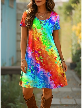 Damen Minikleid T-Shirt-Kleid A Linie Kleid Sommerkleid Lässig Strand Ferien Normale Passform Blumen Grafik Kurzarm Rundhalsausschnitt Blau Rote Leicht Braun Orange Sommer Frühling