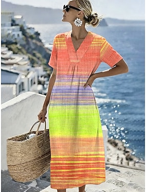 Damen Midikleid Shiftkleid Sommerkleid Urlaub Lässig Strand Täglich Ausgehen Lässiger Schnitt Ombre Grafik Kurzarm V Ausschnitt Blau Rosa Purpur Orange Sommer Frühling