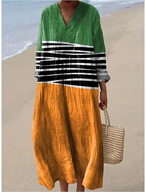 Damen Midikleid A Linie Kleid Urlaub Lässig Täglich Normale Passform Grafik Geometrisch Langarm V Ausschnitt Blau Purpur Orange Grün Sommer Frühling