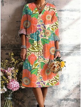 Damen Knielanges Kleid Shiftkleid Lässig Normale Passform Blumen Grafik Dreiviertelarm Rundhalsausschnitt Rosa Orange Grün Sommer Frühling