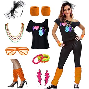 Disko 1980er Austattungen T-Shirt-Ärmel Damen Kostüm Stirnbänder Stränge Halskette Jahrgang Cosplay Maskerade Party & Abend Klub Mehre Accessoires Schlager Outfit