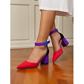 Damen-Pumps im Vintage-Stil der 1950er mit Blockabsatz und Knöchelriemen in Farbblock-Optik – spitze Abendschuhe in leuchtendem Pink, Orange und Lila für Partys, Hochzeiten und Abendveranstaltungen