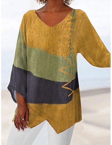 Damen Übergröße T Shirt Knöpfe Fließende Tunika Farbblock Basic Langarm V Ausschnitt Lange Oberteile Lässig Wochenende Blau Orange Grün Grau Herbst Winter
