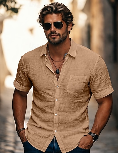 Herren Hemd Leinenhemd Sommerhemd Strandbekleidung Knopfhemd Einfarbig Lässig Strand Schwarz Weiß Orange Grün Kurzarm Kragen Frühling & Sommer Sommer Bekleidung Farbblock