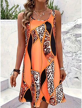 Damen Knielanges Kleid Sommerkleid A Linie Kleid Urlaub Lässig Boho Strand Party Hochzeit Normale Passform Grafik Leopard Geometrisch Ärmellos U-Ausschnitt Gelb Rote Orange Beige Sommer Frühling