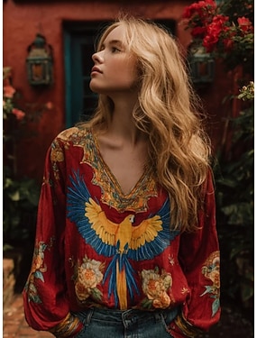 Damen Boho Bluse Leinenähnlich Atmungsaktiv Leicht Floral Grafik Elegant Bohemia Vintage Langarm V-Ausschnitt Reguläre Oberteile Täglicher Urlaub Patchwork Druck Blau Rot Sommer Frühling