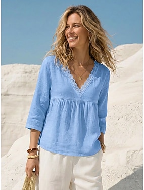 Damen Bluse Baumwollhemd Spitze Patchwork Einfarbig Täglich Stilvoll Basic Dreiviertelarm V Ausschnitt Normale Oberteile Täglich Blau Weiß Grün Khaki Sommer Frühling Herbst
