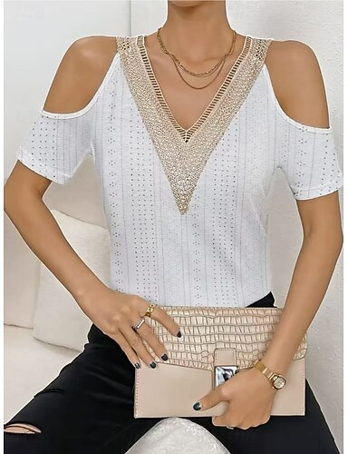 Damen T Shirt T-Shirt Patchwork Spitzenbesatz Einfach Mode Stilvoll Klassisch Kurzarm V Ausschnitt Normale Oberteile Täglich Ausgehen Wochenende Weiß Sommer Frühling