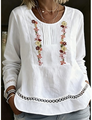 Damen Hemd Bluse Kunstbaumwollleinen Gerafft Patchwork Bestickt Blumen Elegant Stilvoll Basic Langarm Rundhalsausschnitt Normale Oberteile Täglich Ferien Ausgehen Blau Weiß Rosa Purpur Sommer